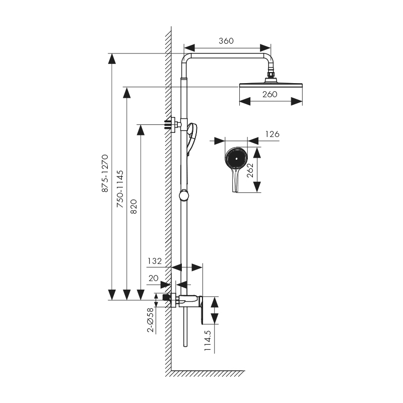 смеситель; релинг; верхний душ; душевая лейка; держатель лейки; шланг; крепления |