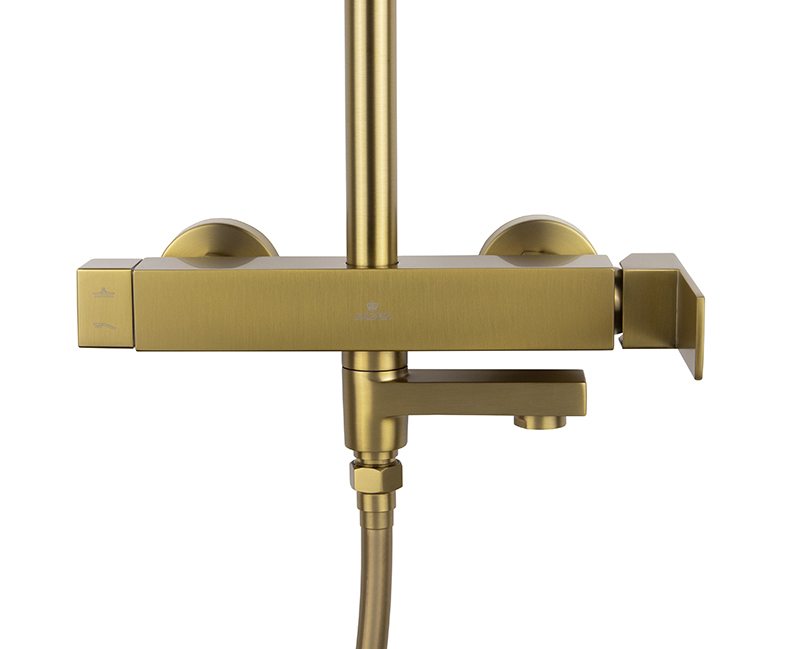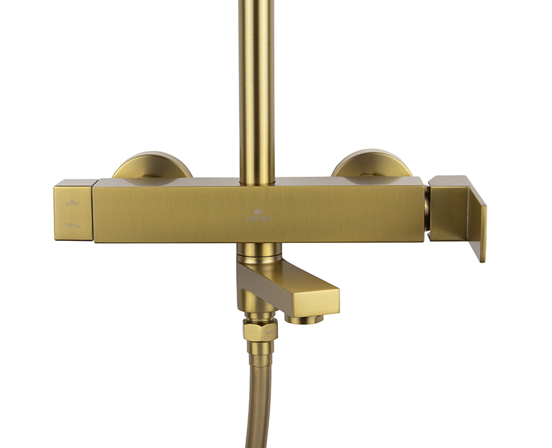 Душевая система KAISER Cube с изливом, с регулируемой высотой верхнего душа, цвет покрытия шлифованное золото