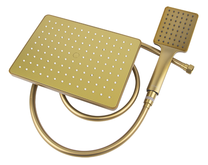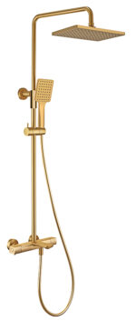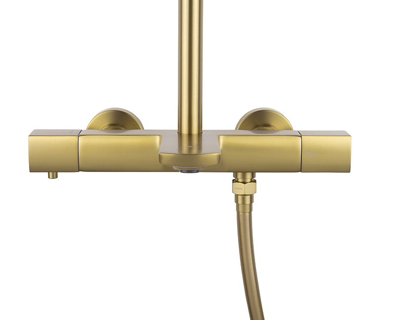 Душевая система KAISER Cube с термостатом и изливом, с регулируемой высотой верхнего душа, цвет покрытия шлифованное золото