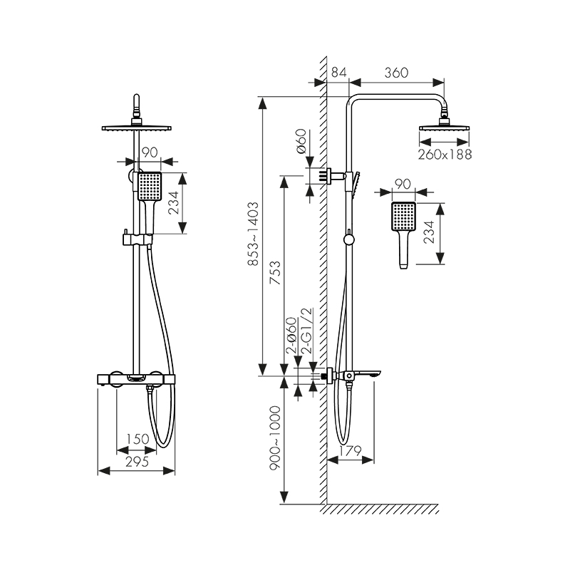смеситель; релинг; верхний душ; душевая лейка; держатель лейки; шланг; крепления |
