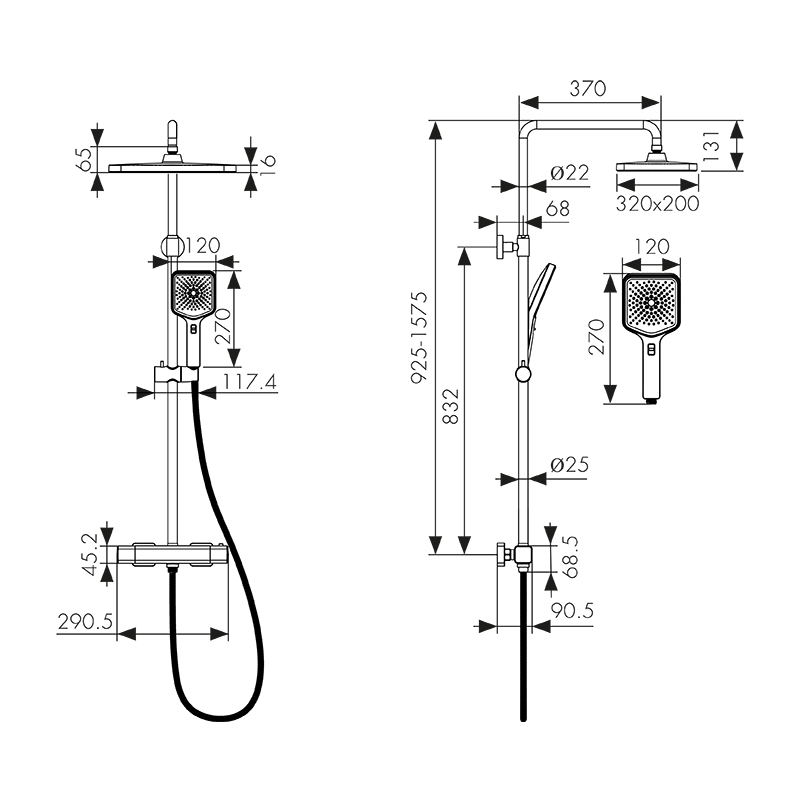 Душевая система KAISER Cube с термостатом и изливом, с регулируемой высотой верхнего душа