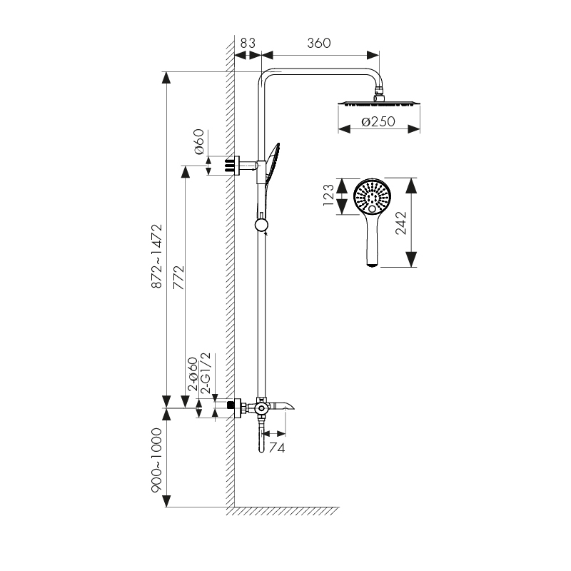 смеситель; релинг; верхний душ; душевая лейка; держатель лейки; шланг; крепления |