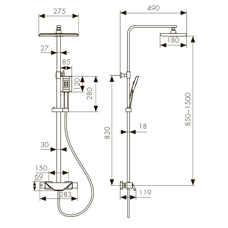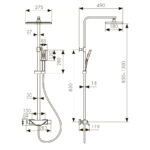 смеситель; релинг; верхний душ; душевая лейка; держатель лейки; шланг; крепления |