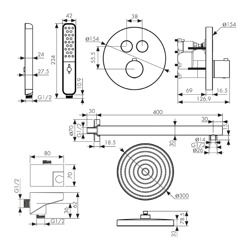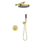 Душевая система KAISER Sano с термостатом скрытого монтажа, поворотн. держатель (4-jet, стац. лейка Ø300*33mm) /Шлифованное золото