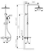 смеситель; релинг; верхний душ; душевая лейка; держатель лейки; шланг; крепления |