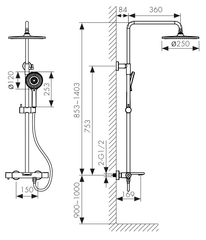 смеситель; релинг; верхний душ; душевая лейка; держатель лейки; шланг; крепления |