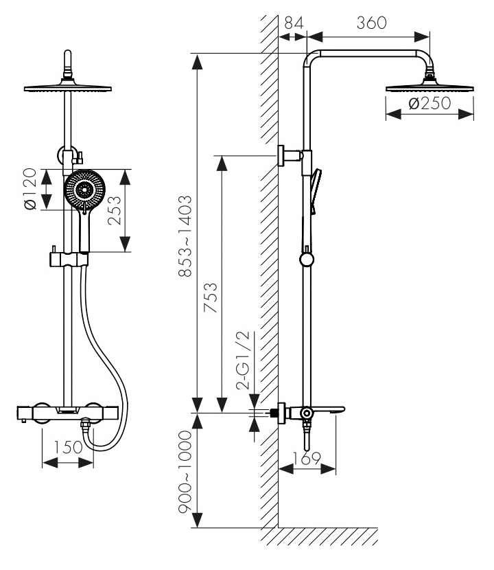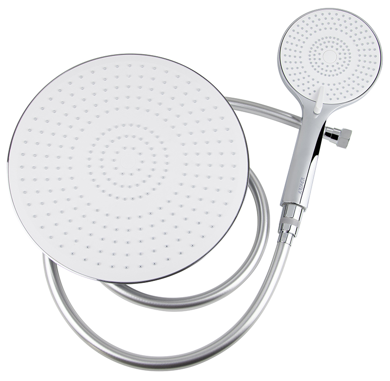 смеситель; релинг; верхний душ; душевая лейка; держатель лейки; шланг; крепления |