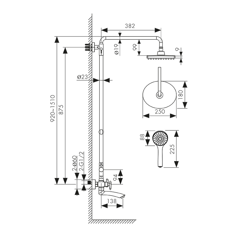 смеситель; релинг; верхний душ; душевая лейка; держатель лейки; шланг; крепления |