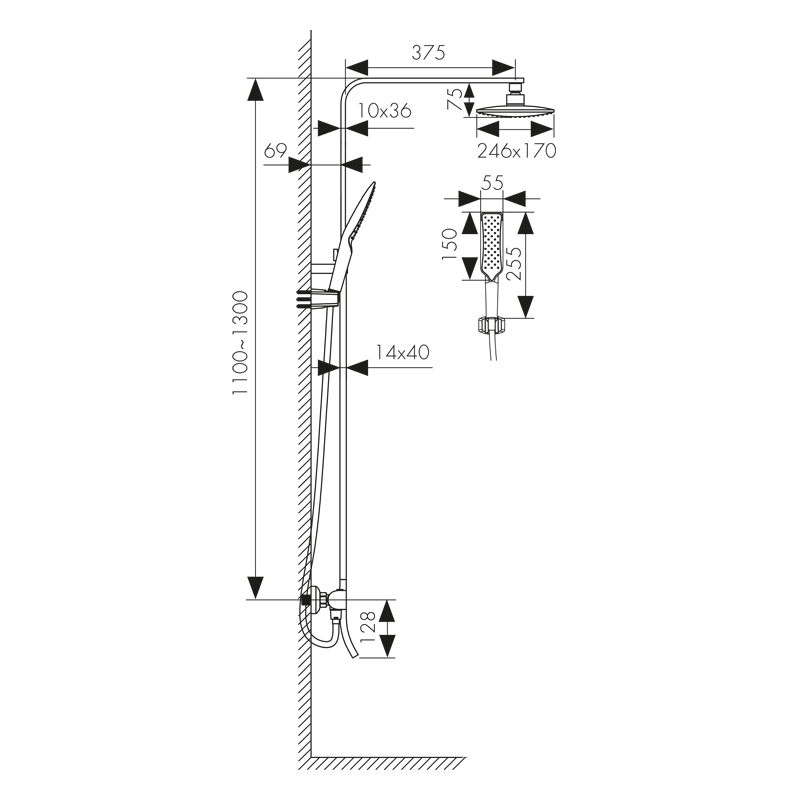 смеситель; релинг; верхний душ; душевая лейка; держатель лейки; шланг; крепления |