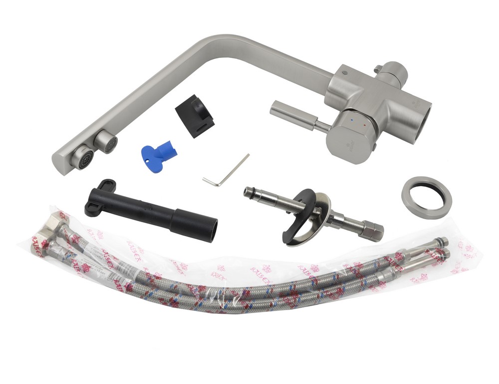 Смеситель Kaiser 40144-5 из коллекции Decor с подключением под фильтр. Для подачи питьевой воды на корпусе смесителя размещен рычаг. Смеситель имеет два аэратора для раздельного выхода проточной и фильтрованной воды, что исключает их смешивания. Преимущество совмещенных смесителей заключается в том, что не нужно делать дополнительных отверстий на мойке и устанавливать отдельный кран для питьевой воды.