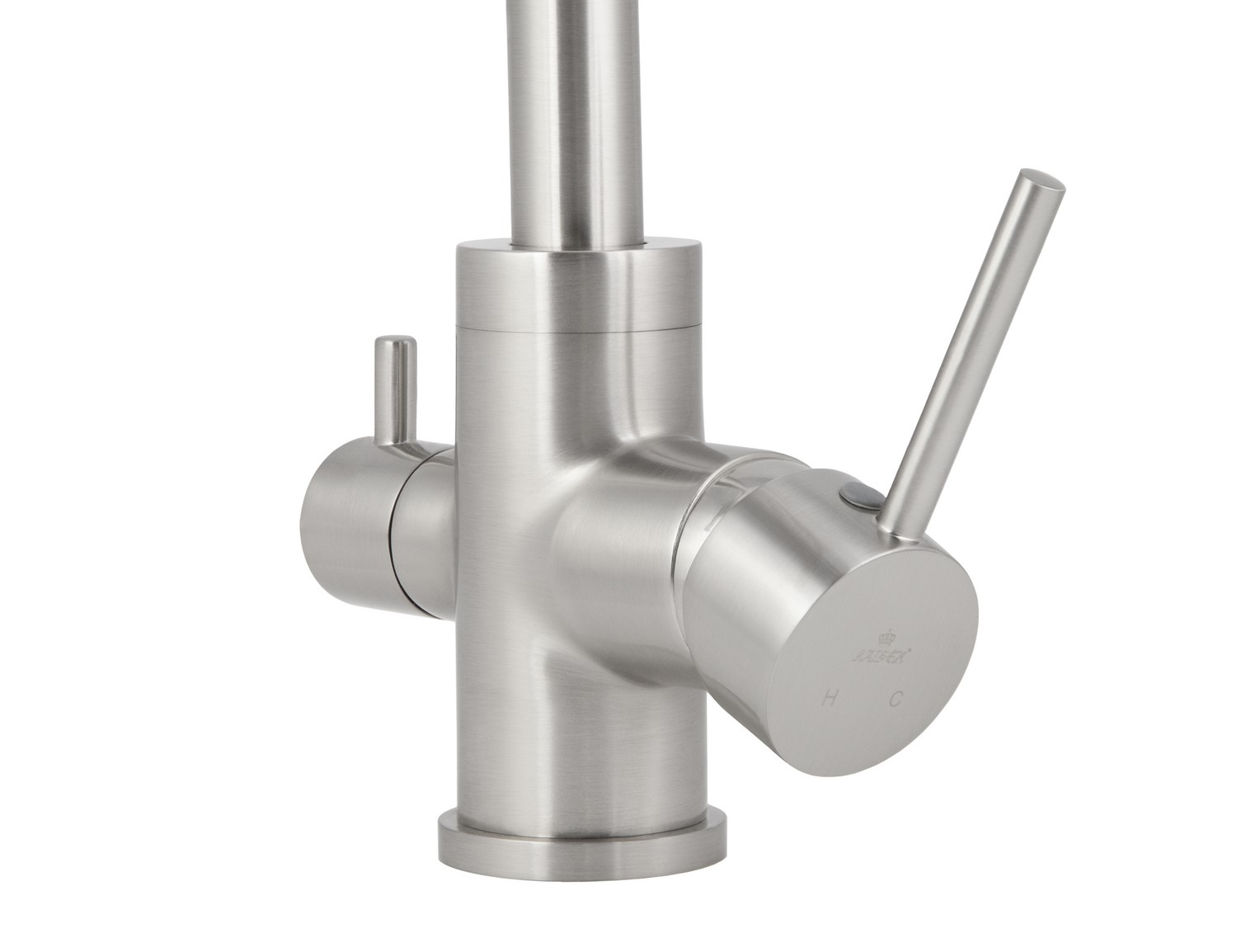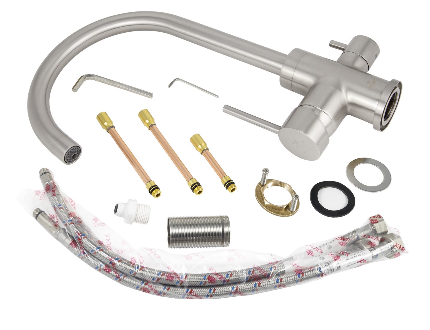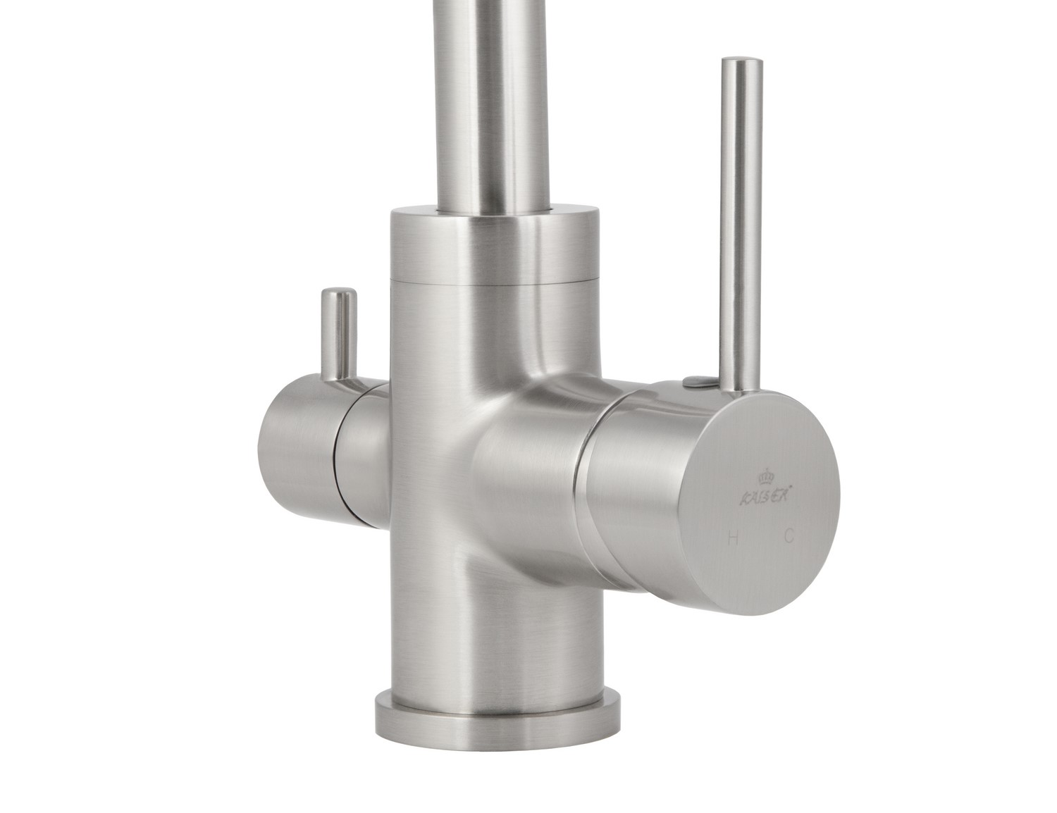 Смеситель Kaiser 26744-5 из коллекции Merkur с подключением под фильтр. Смеситель имеет сдвоенный аэратор, внутри излива проходит трубка для фильтрованной воды, что исключает возможность смешивания с проточной водой. Для подачи питьевой воды на корпусе смесителя размещен рычаг. Преимущество совмещенных смесителей заключается в том, что не нужно делать дополнительных отверстий на мойке и устанавливать отдельный кран для питьевой воды.