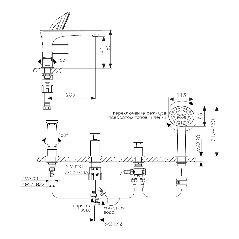 Смеситель KAISER Star для ванны на 4 отверстий Ø35, с подводками