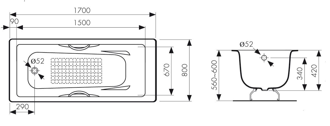 1705 Ванна KAISER чугунная 1700*800*420 с латунными ручками